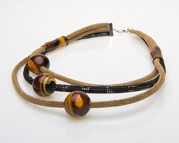 La seta, lavorata in modo da ricordare la pelle di un serpente, si accompagna agli elementi in vetro soffiato, dai colori naturali e striati, per un effetto che richiama lavorazioni lontane nel tempo e che lega una delle maestranze più celebri del Made in Italy all’arte tribale che ha segnato la storia dell’umanità. Una parure per celebrare e al contempo indagare ciò che siamo e ciò che eravamo.